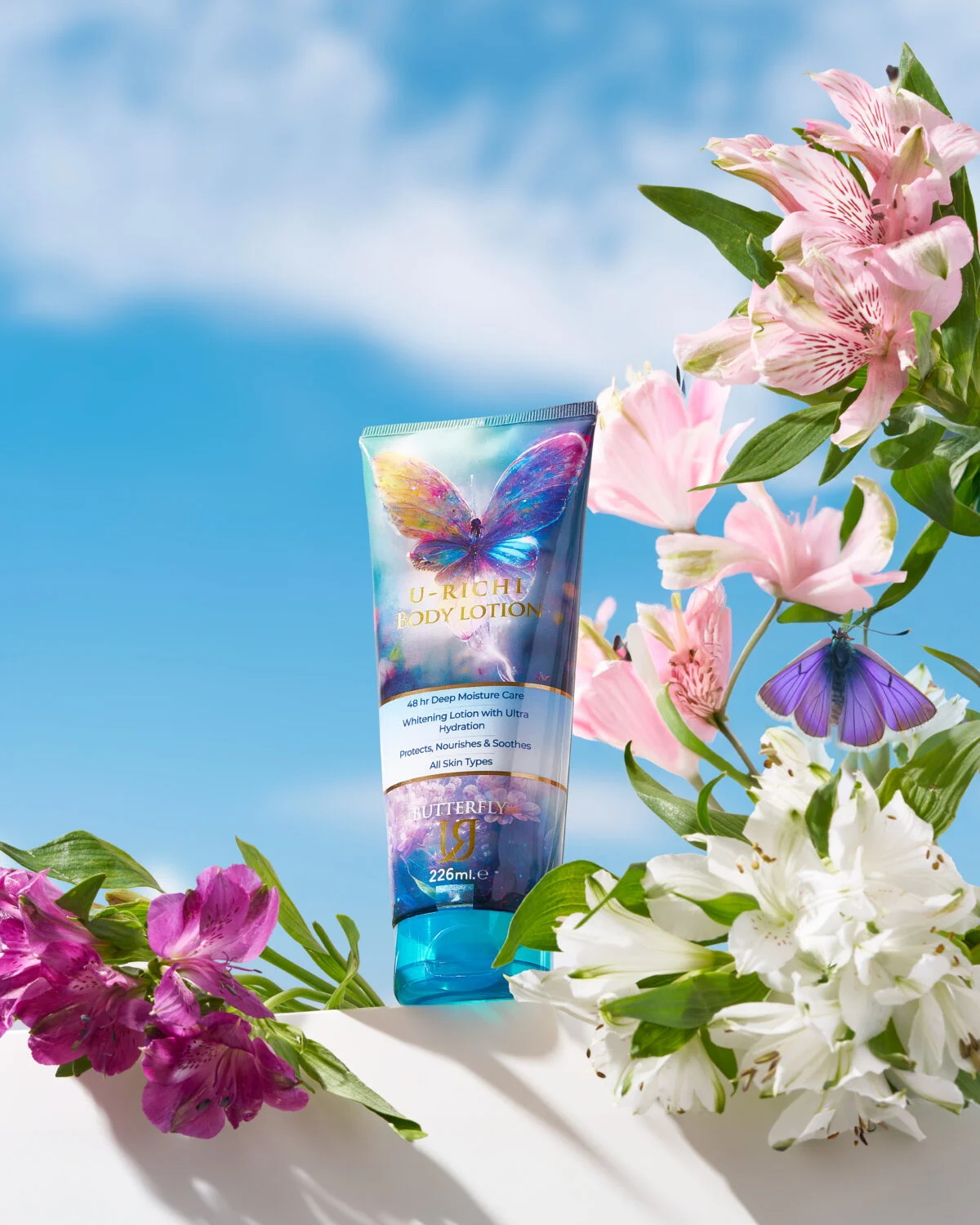 Indulge your senses and skin with U-Richi Body Lotion in the delicate Butterfly scent. This lotion provides extraordinary care and deep hydration that lasts for up to 48 hours, ensuring perfect softness all day long. Its advanced formula effectively works to whiten the body’s skin tone while providing essential nourishment and soothing relief. Lightweight and fast-absorbing, it is designed for all skin types to deliver a radiant look and an irresistible, enchanting fragrance.